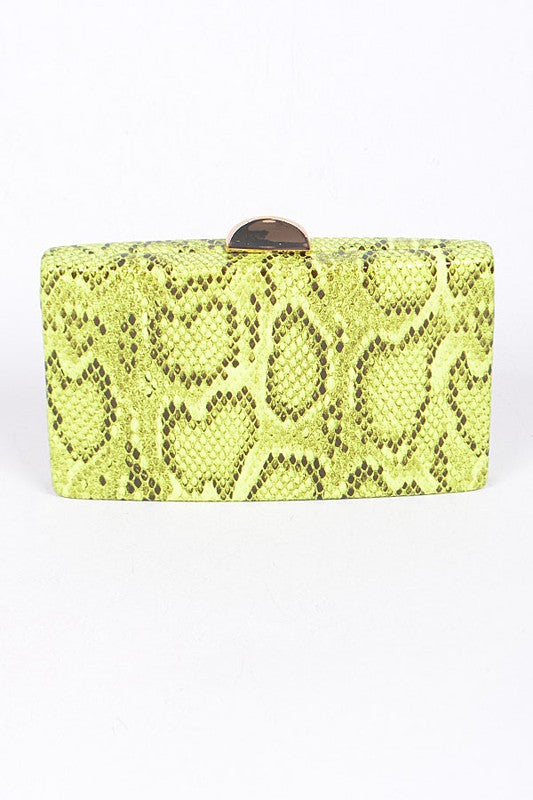 Description: Faux Reptile Skin Clutch With Chain Details